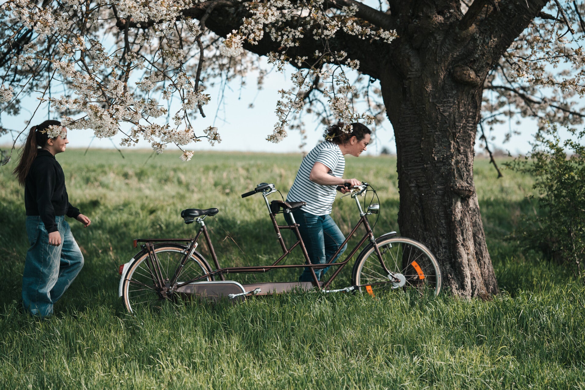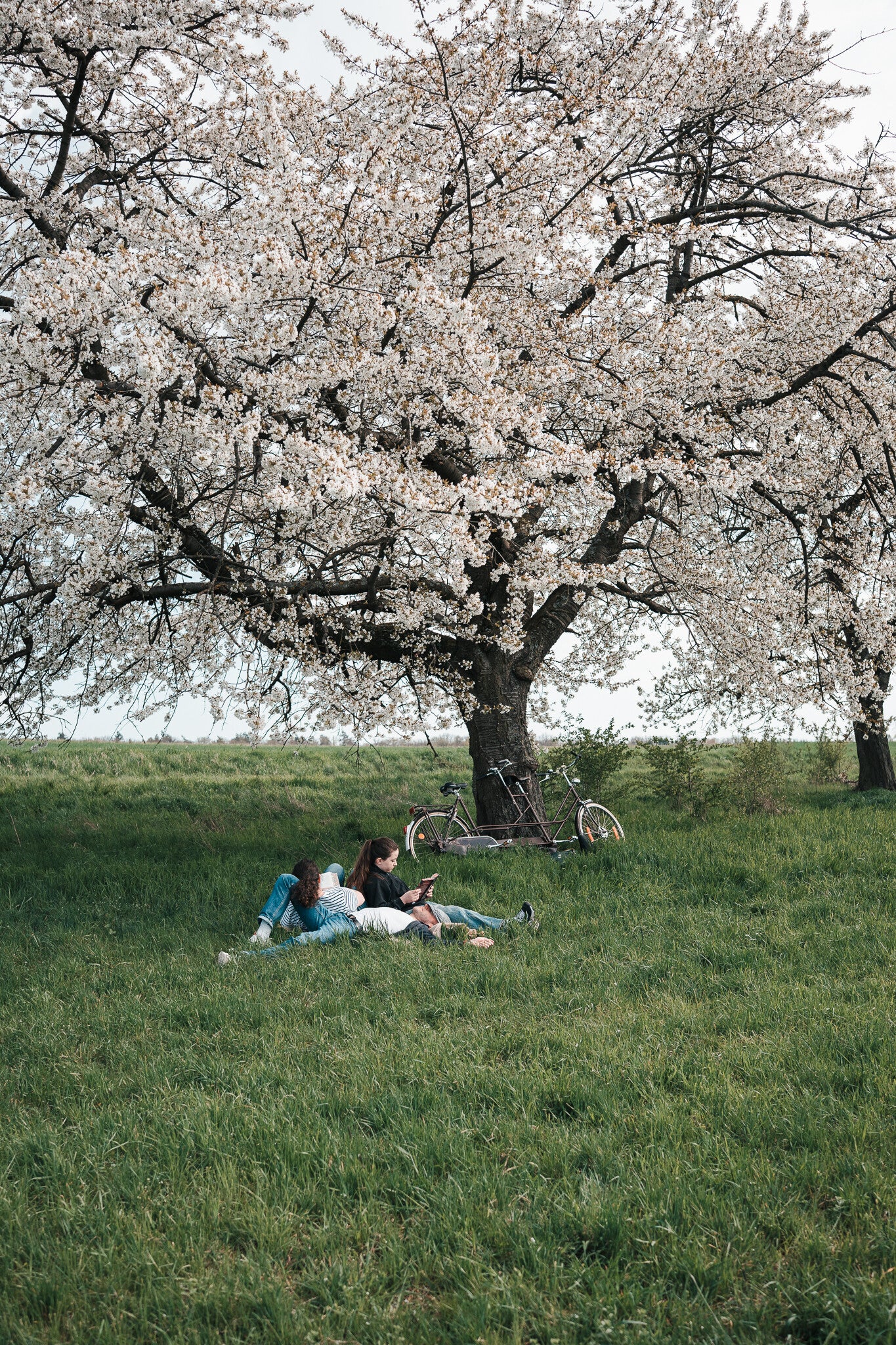 Mutter und Tochter machen einen Ausflug mit dem Tandem-Rad. Der Vater erwartet sie bereits an der Wiese mit dem großen Kirschbaum. Sie breiten eine Decke aus, machen es sich gemütlich und lesen gemeinsam.